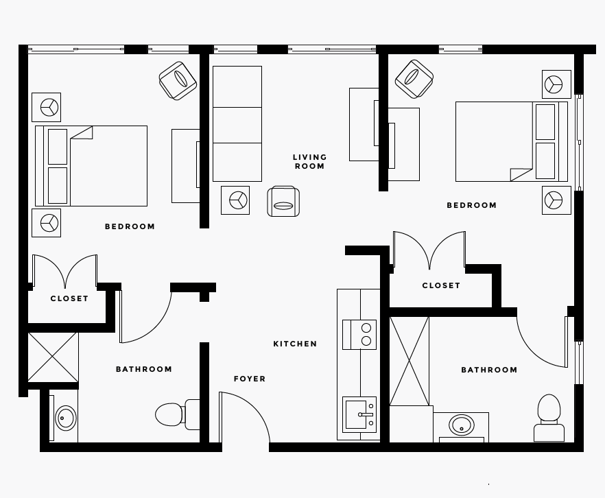 Modena Reserve at Bethesda offers a variety of Assisted Living floor plans to choose from. Each apartment features a kitchenette opening to a comfortable living room with oversized windows bringing in plenty of natural light. For those wanting more space, the two-bedroom layout is ideal, combining luxury and convenience, with two full bathrooms, generous closet space, and large windows.