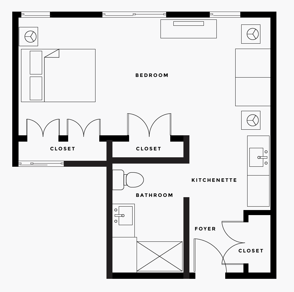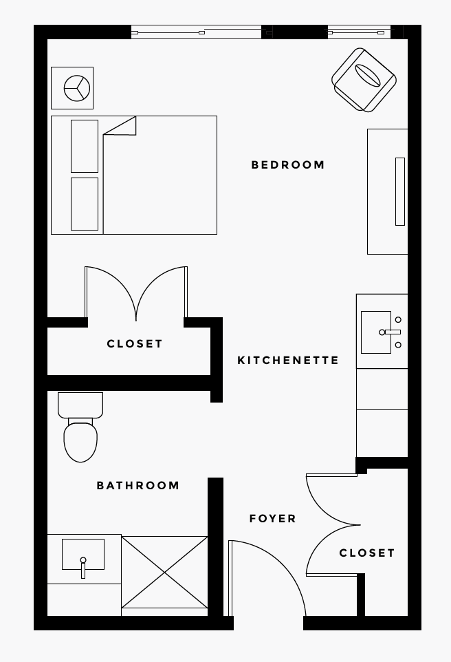Memory Care studios provide just the right amount of comfort and convenience with ​bright windows, generous closet space, and a private bath with safety features to support ease of living.